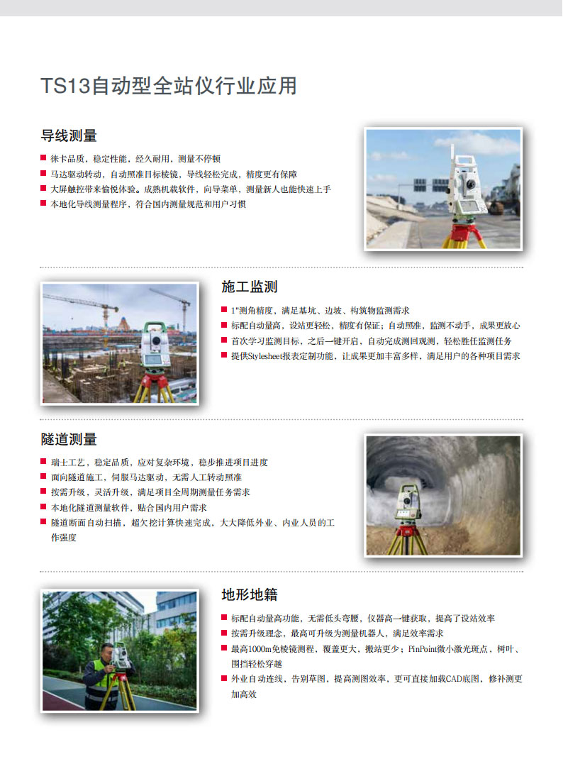 1”測(cè)角,1mm+1.5ppm測(cè)距,滿足測(cè)繪、施工全周期應(yīng)用需求,標(biāo)配自動(dòng)量高,愉悅測(cè)量體驗(yàn)徠卡測(cè)量全站儀產(chǎn)品擁有豐富的測(cè)量解決方案,經(jīng)過(guò)長(zhǎng)期的積累,無(wú)論基礎(chǔ)測(cè)繪還是工程測(cè)量,或者是監(jiān)測(cè)檢測(cè),亦或是特種測(cè)量,我們都有合適的解決方案供您選擇。